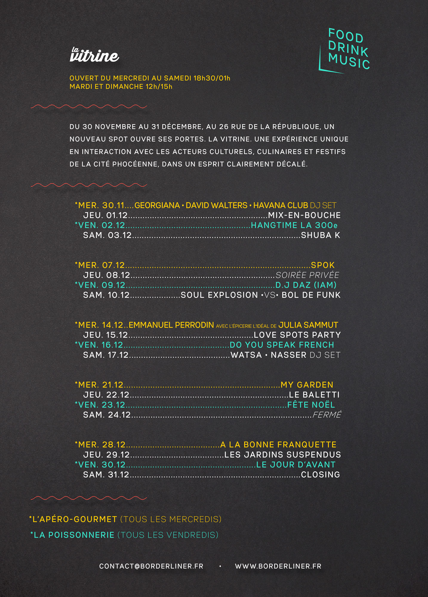 Un mois complet où, dans un lieu secret totalement redécoré, transformé, revisité la crème des acteurs festifs, artistiques et culinaires de la Cité Phocéenne vont se retrouver, se croiser, (re)inventer la fête avec des rendez-vous fous et comme seule envie commune agiter les murs de cette Vitrine pas comme les autres et mettre du bonheur dans le coeur de ses visiteurs.